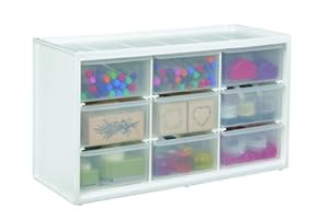 Store-in-drawer cabinet conveniently stores any number and size of supplies Stackable and can be wall mounted Sturdy white plas